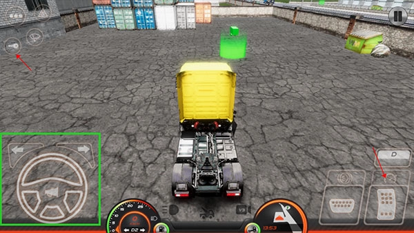 2、首先点击左上角的菜单,接着点击钥匙启动汽车,随后点击右下角踩油门让车辆前进,绿色区域对应的是方向盘。