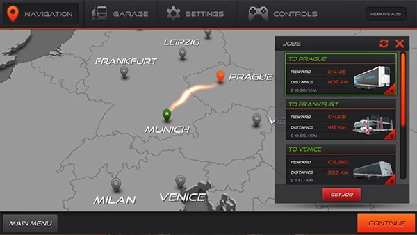 3、控制卡车行驶到指定的绿色区域领取任务,每个任务的地点和货物都不一样,你可以点击选择适合自己的任务,之后再按下“GET JOB”按钮。