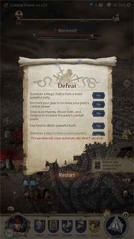3、当所有英雄都阵亡后,Monarch的移动会停止,状态将切换为[失败]。