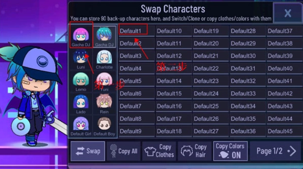 进入人物备份界面后,左侧显示当前已创建的角色,右侧是角色备份区域。若要复制某个角色,需先在左侧选中目标角色,再点击右侧备份区域里的任意一个Default选项,即可将该角色备份到对应位置。
