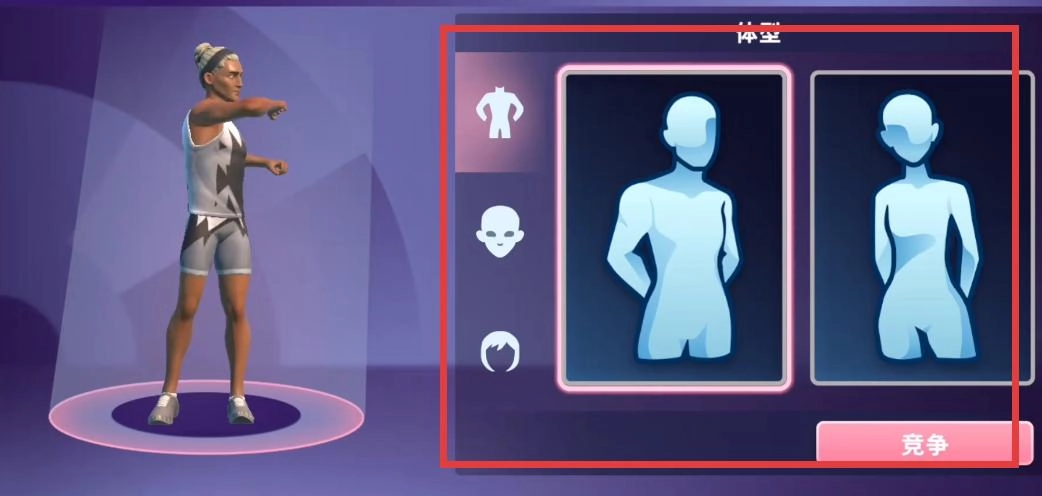 2、在角色创建页面的右侧设置体型选择区域,包含男性和女性模型选项。用户点击选择相应体型后,可搭配发型与服饰,全部设置完成后点击“竞争”按钮,即可进入赛事准备环节。