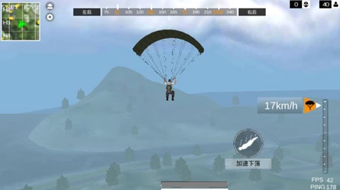 进入游戏后,你会出现在一架飞机上。当到达你想要降落的位置时,点击屏幕右侧的按钮就能跳下飞机。跳下飞机后,你可以通过左边轮盘的“向上”按钮实现极速下降,用“左”“右”按钮来控制左右移动;同时,也能通过滑动屏幕来观察周围的环境。
