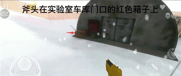 1、斧头在实验室车库门口的红色箱子上;