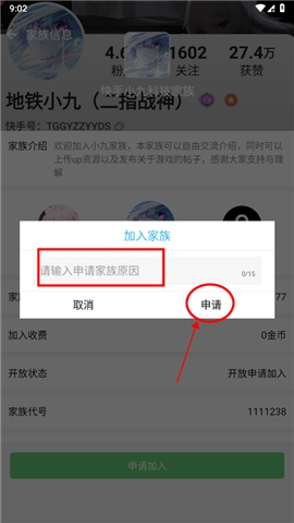 5、输入申请家族原因,点申请,会提示已提交申请;