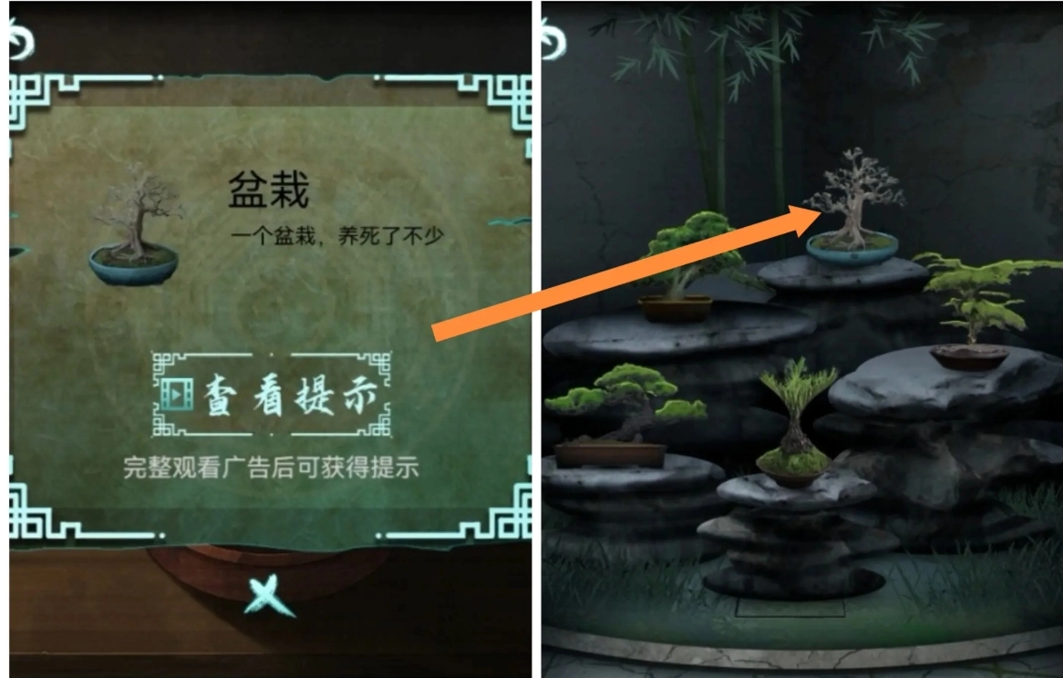 10、先在正屋取来盆栽,接着前往假山位置,把盆栽放置好,再依据提示调整盆栽的摆放位置,以此获取八卦盘,最后将八卦盒安置在棺材的凹槽部位。