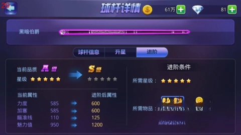 进阶需要准备对应球杆的碎片和金币,这些材料备齐后就能启动进阶流程。