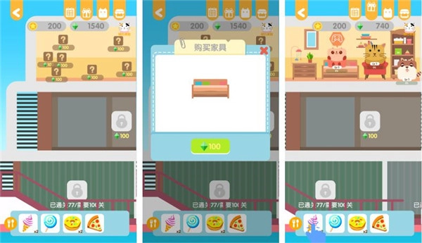 4、当第一个房间的家具全部解锁后,小动物们便陆陆续续地搬了进来。接下来,你可以把下方的食物拖到小动物身上喂它们吃,不过拖动食物到小动物身上后得稍作停留。等小动物吃完,不仅会给我们金币作为奖励,还能提升亲密度,而亲密度可以用来升级。