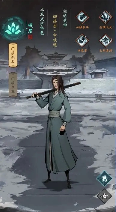峨眉武学刚柔并济,剑招势若雷鸣,拳法灵动如白猿。其武学体系整体亦追求平衡之道,故而在攻击特性上与武当有几分相似。