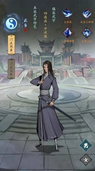 武当为内家武学之宗,道法渊深且剑法迅猛,然其崇尚平衡与自然之道,讲究攻守一体,故而在六大门派里亦居于相对均衡之境,身法轻盈灵动。