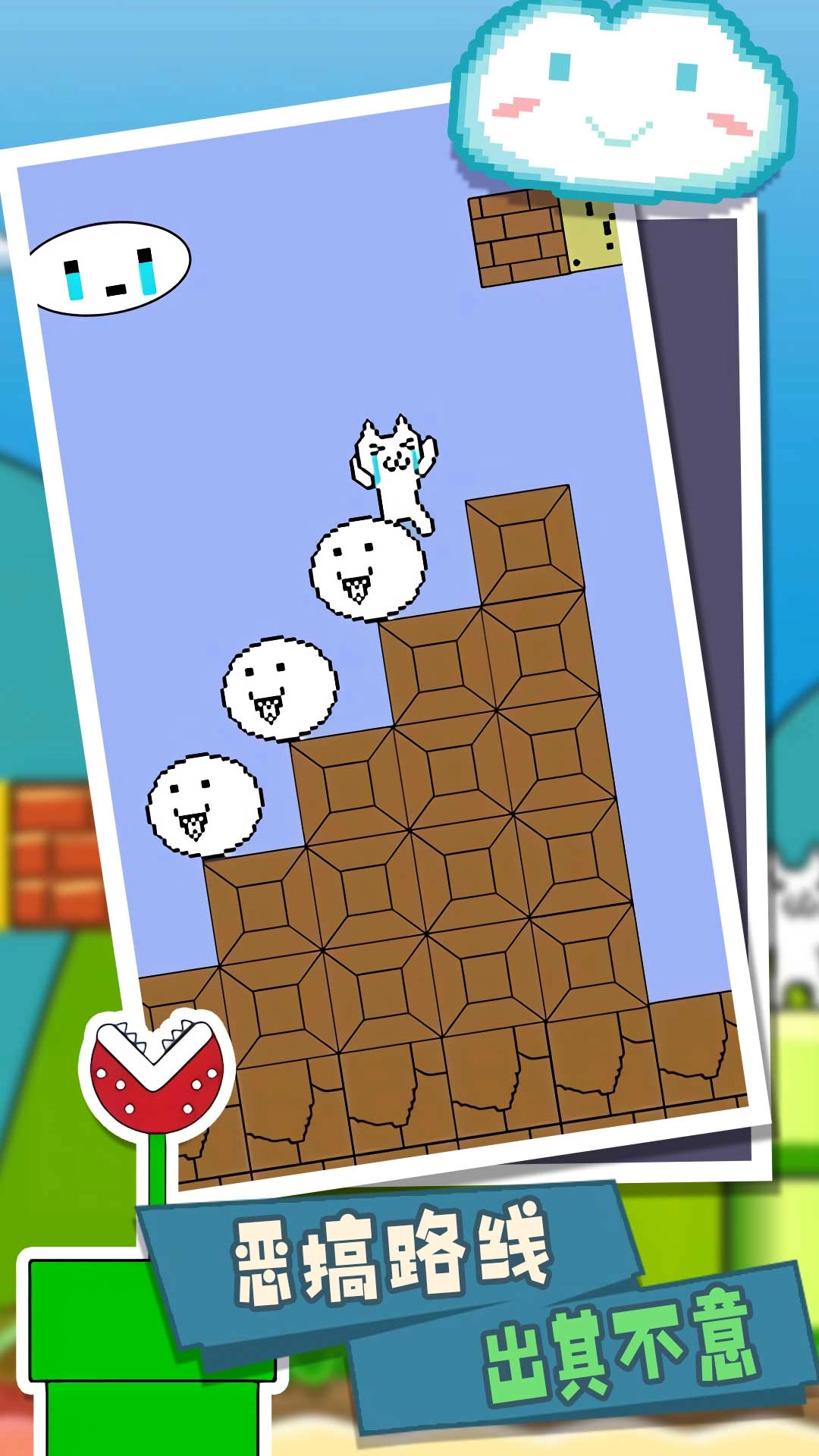 1、操控猫咪在关卡里跳跃前进,关卡中设置了砖块、食人花等多种障碍,经典元素一个都不少。