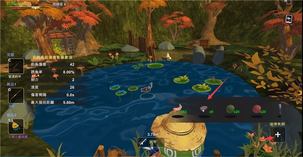 1、来到鱼塘旁,选择鱼饵以及诱饵;