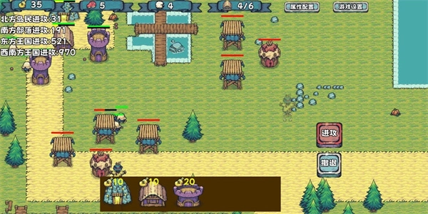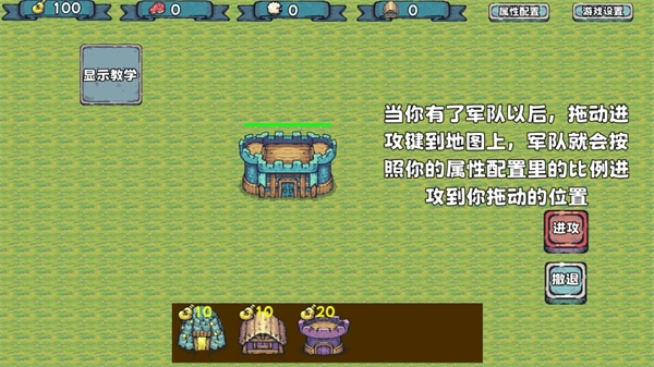 3、在闯关过程中,玩家需注意:当拥有军队后,将进攻键拖动到地图上,军队便会依照属性配置中的比例,向拖动的位置发起进攻。