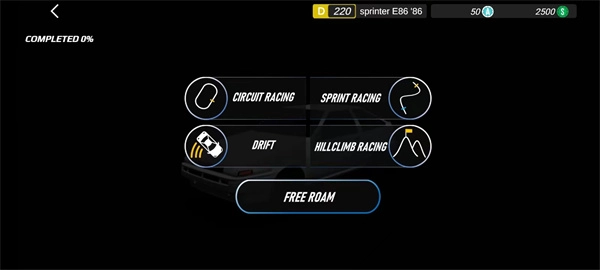 3、登录完成后,能看到赛车、短跑、漂移、爬坡比赛等多种模式,玩家可以自行选择体验,这里我们以赛车模式为例。