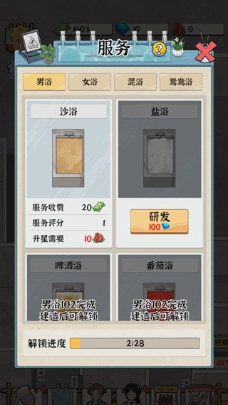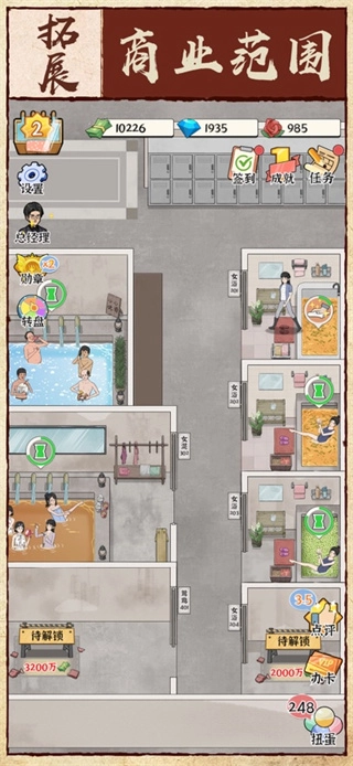 《浴场之王》的整体操作玩法相当轻松简单。作为洗浴场经营者,若想吸引更多顾客,玩家需解锁并提供更多泡汤服务;同时,还得运用各类营销手段来招揽客源、积累财富,最终成为名副其实的“浴场经营之王”!
