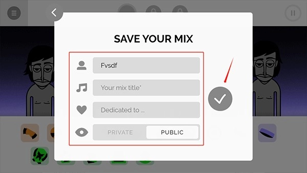 5、比如录制操作,在完成节奏混音的录制后,把混音的名字、标题以及权限都设置妥当,再点击右侧的√按钮。