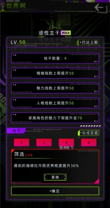 抽卡分解后获得的材料数量中,设计图的数量最多,人格核心次之,模因样本最少。支干满级为4级,重置后会随机提升等级或增加其他属性,每个支干最多可装备4个。