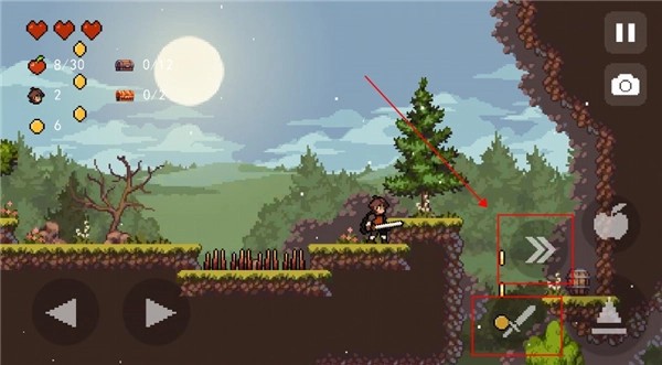 5、左侧的两个按键用于控制左右移动,右侧的按键是跳跃键,双击该键可实现二段跳,这一功能可用于躲避敌人的攻击以及翻越障碍物。