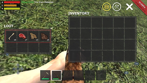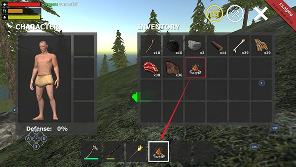 6、搭建完成后,在INVENTORY里能看到一个营火图标,把这个图标拖到石斧所在那一行的6个小框框中。
