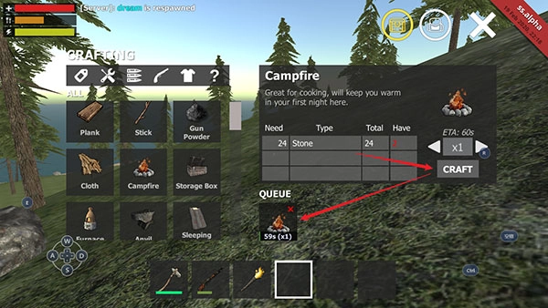 4、右侧显示搭建营火需要24块石头。