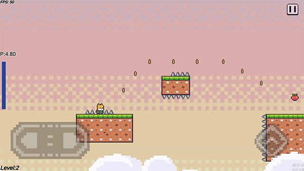 2、长按跳跃键能够触发喷气效果,使小狐狸腾空飞起,玩家可操控方向去收集上方的金币,只要收集到草莓就能顺利通关。