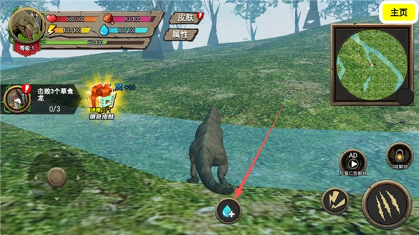 4. 当恐龙口渴并走向河边时,点击“饮水”按钮就能补充水分。