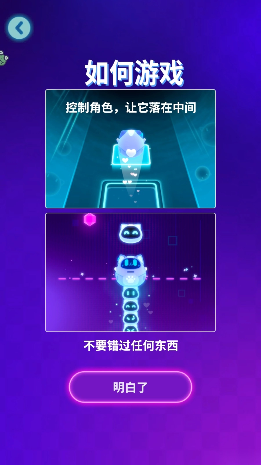 1、进入操作界面后,会显示角色控制说明,引导玩家让角色落在方块上