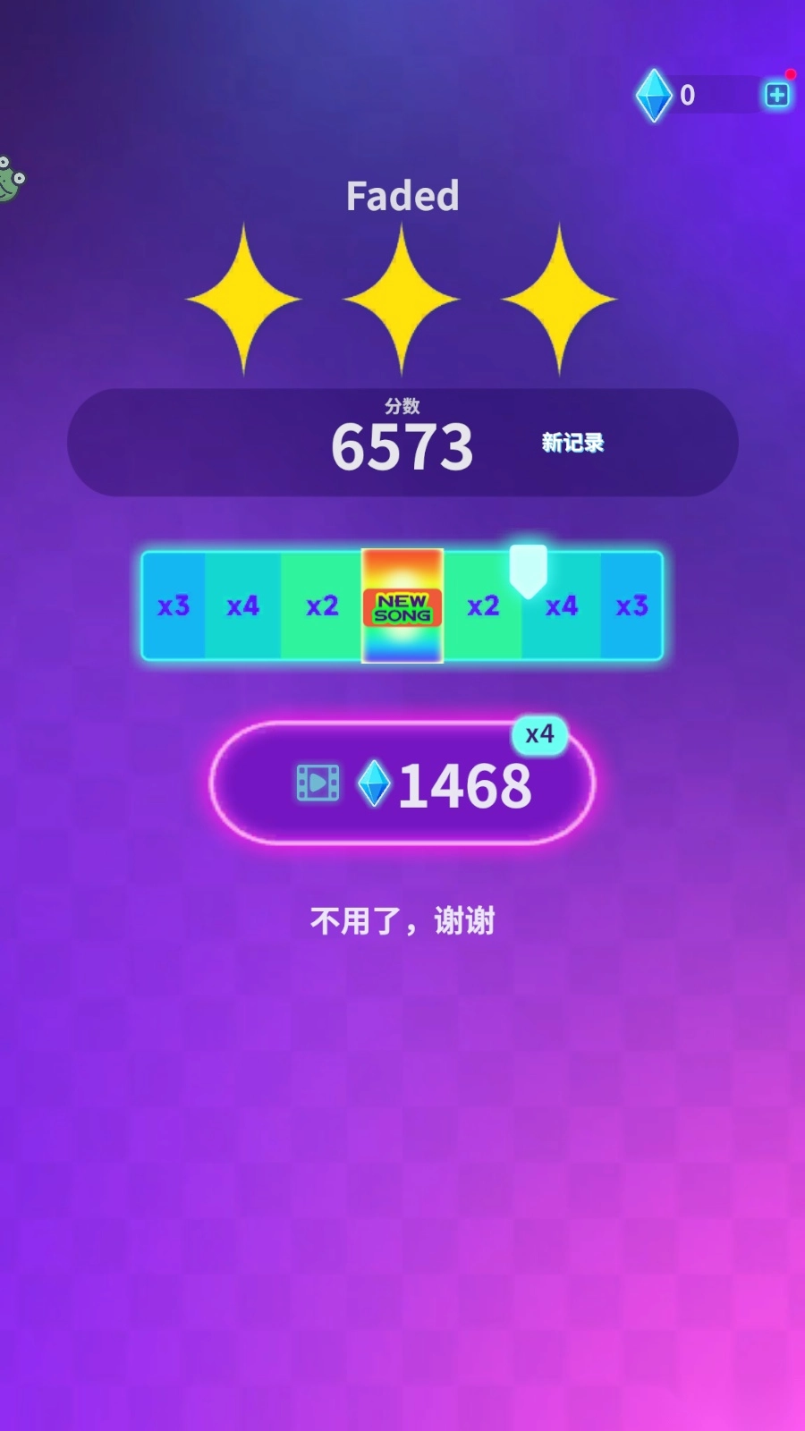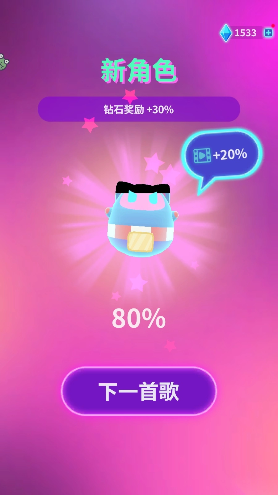 7、解锁新角色后可获得30%的钻石奖励加成,点击下一首歌曲即可继续游戏。