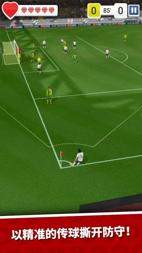 1、玩家可以在角色的可控范围内通过滑动屏幕来传球或是射门。每一关需要玩家通过这样的操作来传球直到攻破敌方的大门位置。如果从定点传球和定点射门的角度来说,本作的难度的确不高。毕竟不能达到像实况或者fifa那种操作流畅程度。