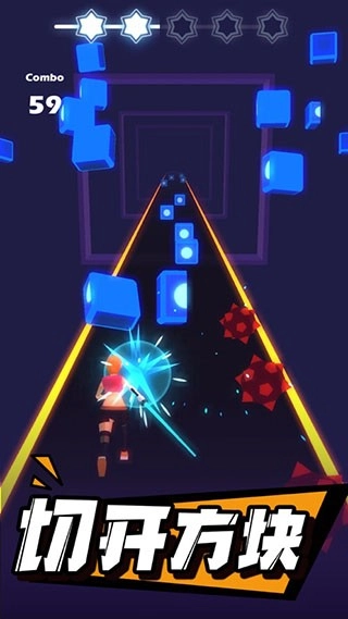 2、在VR带来的沉浸式视角里,手持一把光剑,随着音乐的节奏挥舞它斩断迎面而来的节奏物块,体验切割时的酣畅快感,同时还要避开不断飞来的障碍物。