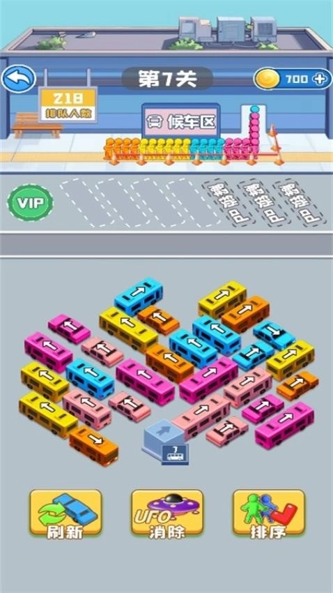 3、玩家需要仔细留意正在排队的旅客的颜色与数量,慎重挑选下方停车场里停着的不同大小的客车。