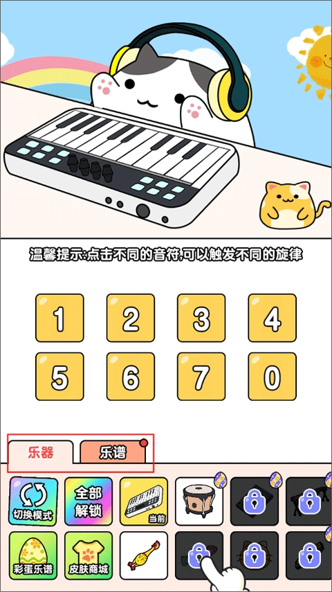 玩家可以按照自己的喜好排列音符,小猫猫会根据音符敲击对应的琴键,和小猫猫一起在这里弹琴吧。在节奏猫咪里,玩家除了能弹奏不同类型的乐谱,还可以解锁各种各样的乐器,除了钢琴,还有吉他、大鼓等,游戏中还有一些有趣的内容等着你来探索,快来体验吧!