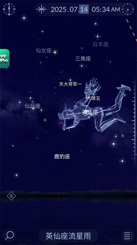 1、实时星空匹配功能:在搜索框中输入流星雨的名称,软件便会自动标记出其辐射点的具体位置(例如英仙座流星雨的辐射点就处于英仙座所在的方向)。