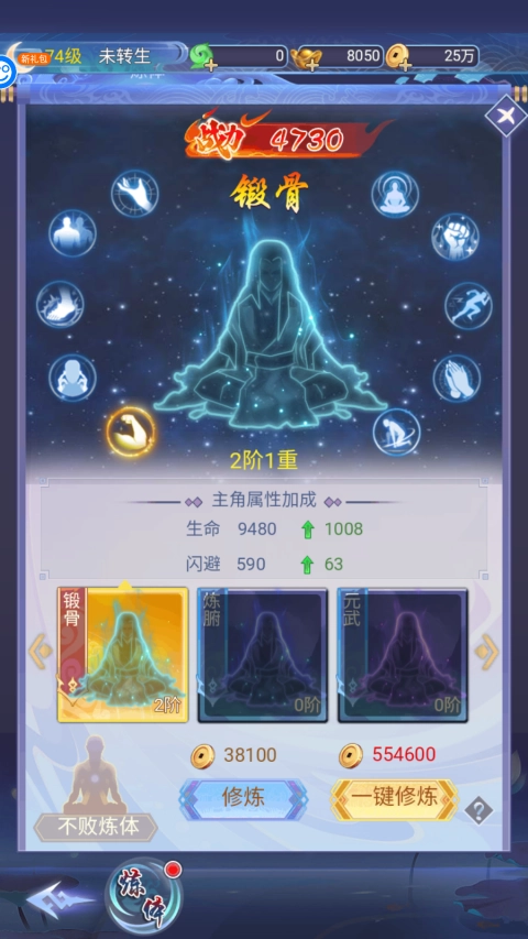 主角在转生等级满足对应条件时,就能解锁炼体修炼;不同的炼体类型,所需的转生等级解锁要求各不相同。消耗金币可以对已解锁的炼体进行修炼,每次修炼都能为角色带来大幅的属性提升。不过炼体修炼存在等级上限,一旦达到上限,就需要先提升主角的转生等级,才能继续进行炼体修炼。当已激活的炼体数量达到规定要求,并且每一项都修炼到指定阶数时,就可以开展不败金身的升阶流程,不败金身升阶后同样能为主角增加大量属性。