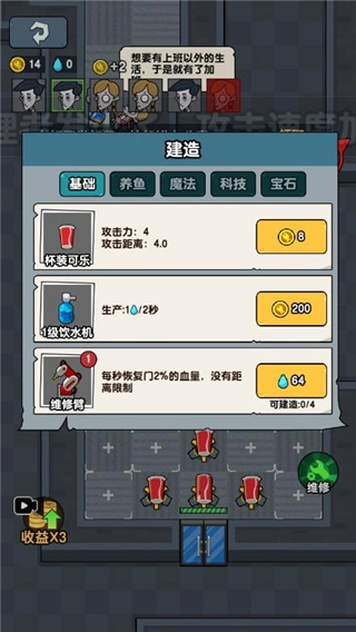 选好办公室后,先把床的等级升上去,再建两个炮台。这时候老板还没出现,所以得优先升级计算机来快速赚金币,之后再去提升门的等级。等计算机升到一定程度可以先停一停,把重点放在升级门上,不然老板很容易突破进来。等门升级到需要电力的时候,再去商店买发电机,不然还是容易被老板突破。