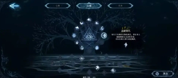 下面的技能可供你挑选,最下方有“神性之种”四个字,代表着你当前能够选择激活的技能数量。请注意,这些技能只有在存档附近才能进行激活或关闭操作,要是你想调整激活的技能,记得先走到任意一个存档处,接着点击后像,再去进行激活操作。