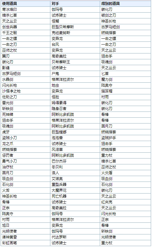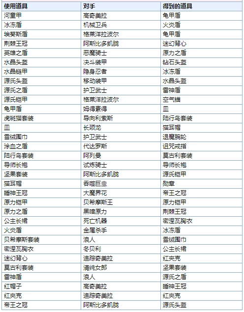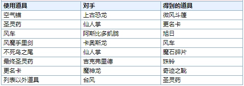 以下是斗技场的道具交换表以及出现怪兽: