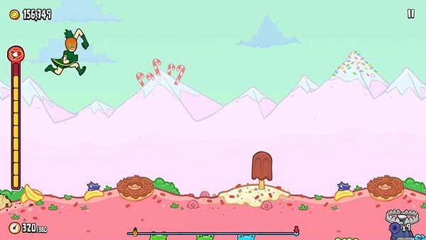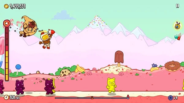 只要点击屏幕让旋转的指针停在指定位置,野牛就会按照对应的力道飞出去。最上方的一颗黄星代表最大弹力,此时野牛会踢中右边的大糖果人,之后基本只能听天由命;飞行过程中,既可以通过践踏小熊人来弹跳,也能使用火箭加速,途中有些糖果人会助你一臂之力,而撞到警察糖果人会让玩家减速,要是速度不够快时压到警察糖果人,就会直接被抓住。每飞行一段距离就会遇到一扇大门,没有足够的速度无法撞破大门,冲开最后一扇门就能回到超市。