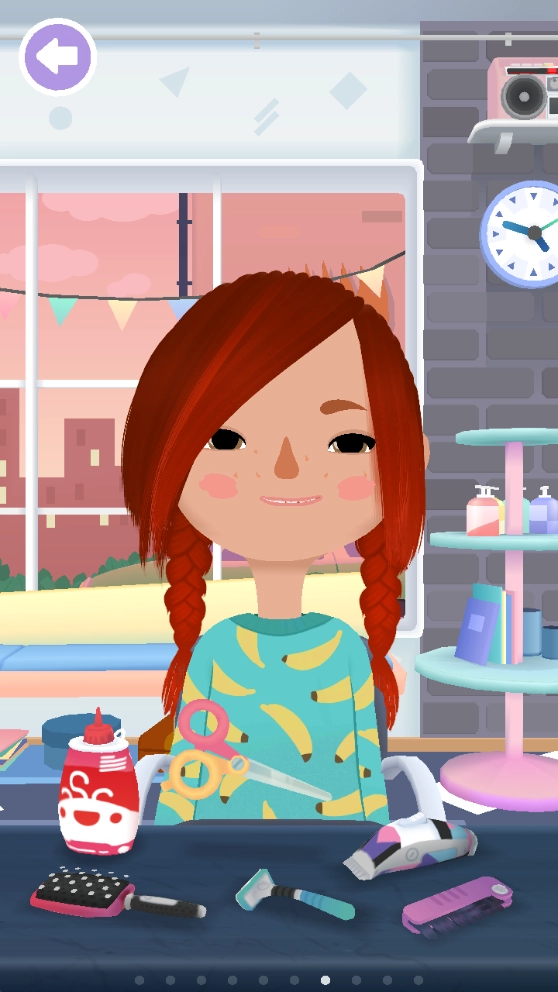 3、这里设有丰富多样的场景,玩家能够通过左右滑动来切换;默认情况下会进入下图所示的页面,待人物坐定后,玩家即可为她修剪发型,打造出自己心仪的样式;此外,桌上的所有物品都可供使用。