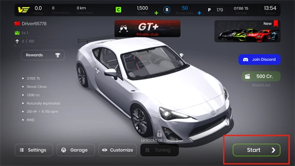 1、启动极速狂飙游戏,选定车辆后点击【Start】按钮开始游戏