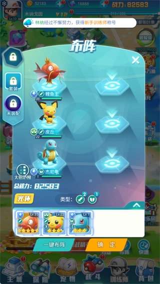合理搭配精灵阵容,调整好站位后点击【确定】就能生效,总战力会在下方实时展示。
