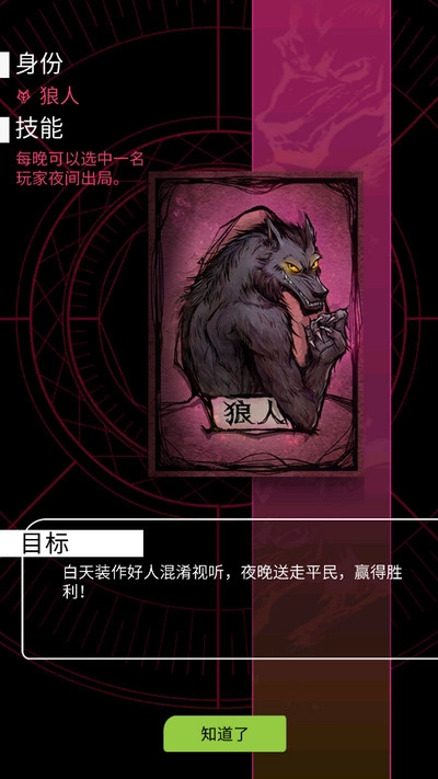 2、接着玩家能够确认自己最终得到的身份,并且知晓该身份对应的胜利目标、特殊功能以及大致的玩法。
