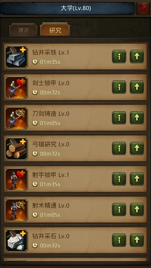 (1)大学:选址于城内的空地块进行建造,建造过程会消耗资源且存在等待时间,使用钻石可立即完成等待;在建筑升级或建造的等待阶段,会占用1个建筑位(即空间);若升级时资源不足,可直接用钻石替代所需资源完成升级操作。