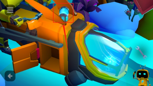 7、回到飞车正前方,点击掀开盖子,再用钳子夹起图示的能量球
