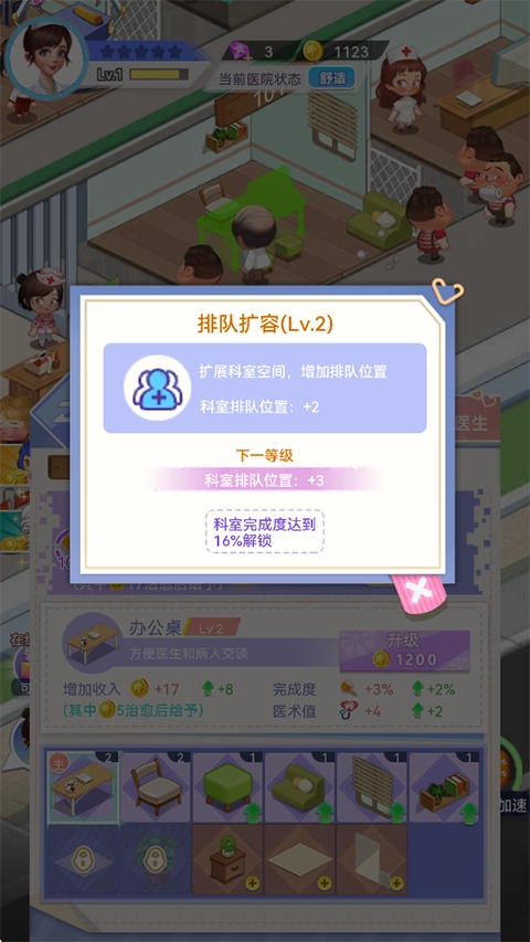 可以通过解锁并建造更多科室来扩展医院的空间。选择“咨询室”建筑进行操作,能够实现排队扩容。