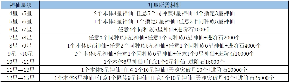 4星神仙晋升5星神仙,需消耗2个同本体的4星神仙、任意5个同种族的4星神仙,以及4个指定的3星神仙。