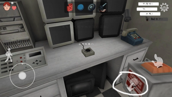 2、玩家需借助地图里的道具逃离此地,点击右侧“手”图标拾取道具,点击左侧人物图标可实现下蹲操作。