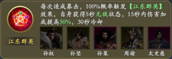 效果:每次打出暴击时,会以100%的概率触发【江东群英】效果——自身将进入5秒无敌状态,同时在15秒内伤害加成提升50%,该效果的冷却时间为30秒。