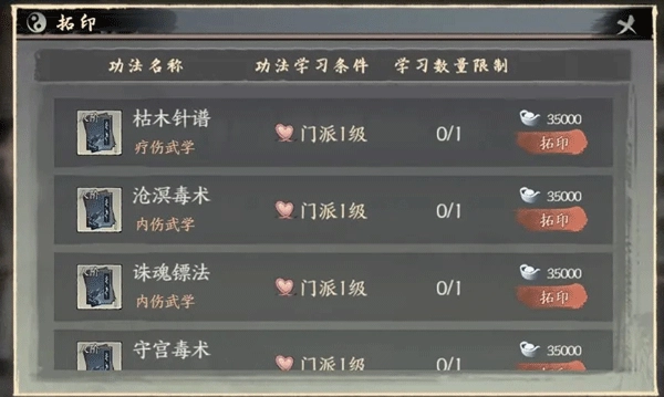 2、点击【求教武学】后,掌门能够在拓印界面用银两购买自己需要的功法。