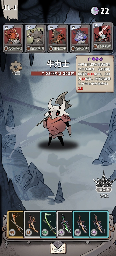 通关策略:移除太刀与匕首之外的所有卡牌,优先消除相同属性的卡牌,最后集中培养最强属性。