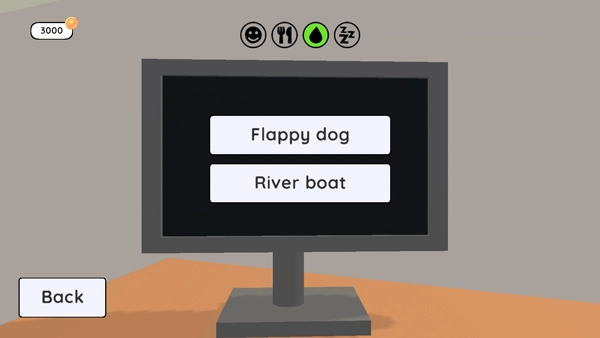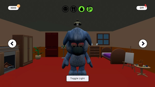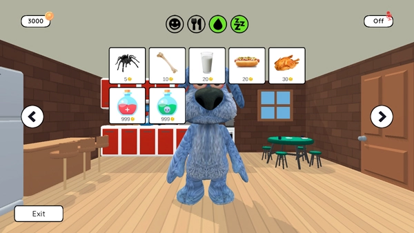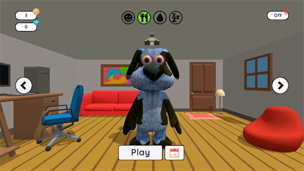 1、进入后就能看到主界面,上方的状态栏会显示巴勃罗的情绪、饥饿程度、饮水需求和睡眠状态。当图标是绿色时表示状态良好,要是变成淡色就意味着需要进行相应的照顾。